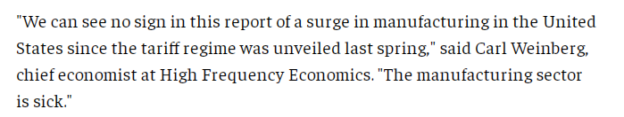 文章说,自今年4月以来,美国政府对部分进口商品加征关税,这在很大程度上增加了美国生产商从国外采购原材料的成本。另外,由于今年大部分时间里关税水平都在波动,关税的不确定性也给美国制造商带来了压力。