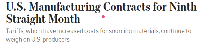 《华尔街日报》1日发表文章称,美国供应管理协会(ISM)当天公布的调查报告显示,11月美国制造业采购经理人指数(PMI)已低于50的荣枯分界线。美国制造业活动连续第九个月萎缩,而美国制造商认为这主要是因为美国政府的关税政策。