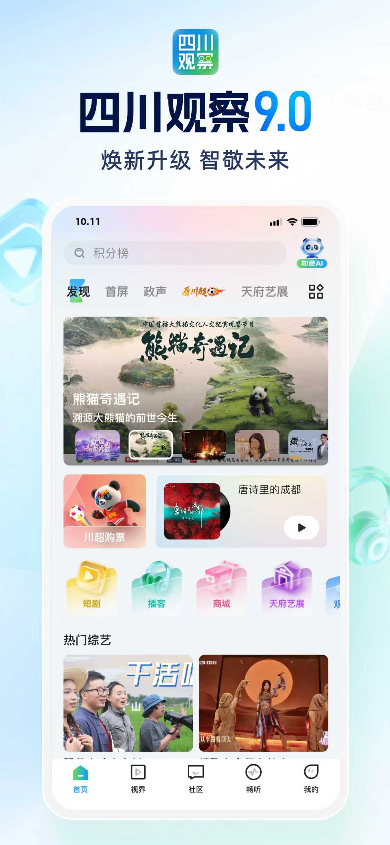 首页以“发现”页为核心,融合音视频与直播,设有综艺纪录片专区及“C位观察家”板块,首屏除更新热点新闻资讯外,突出“看川超”“天府艺展”“原创歌曲大赛”等重点栏目。