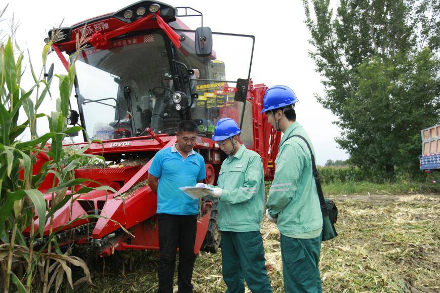 国网高密市供电公司工作人员在玉米地收割现场向农户宣讲电力设施保护知识。