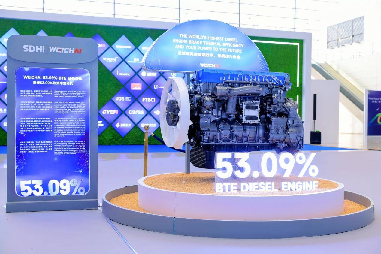 与两台“老伙计”摆放在一起的是潍柴2024年发布的全球首款本体热效率53.09%柴油机,创下本体热效率世界纪录。三台机器共同浓缩成潍柴79年“从可靠到领先”的进阶之路。