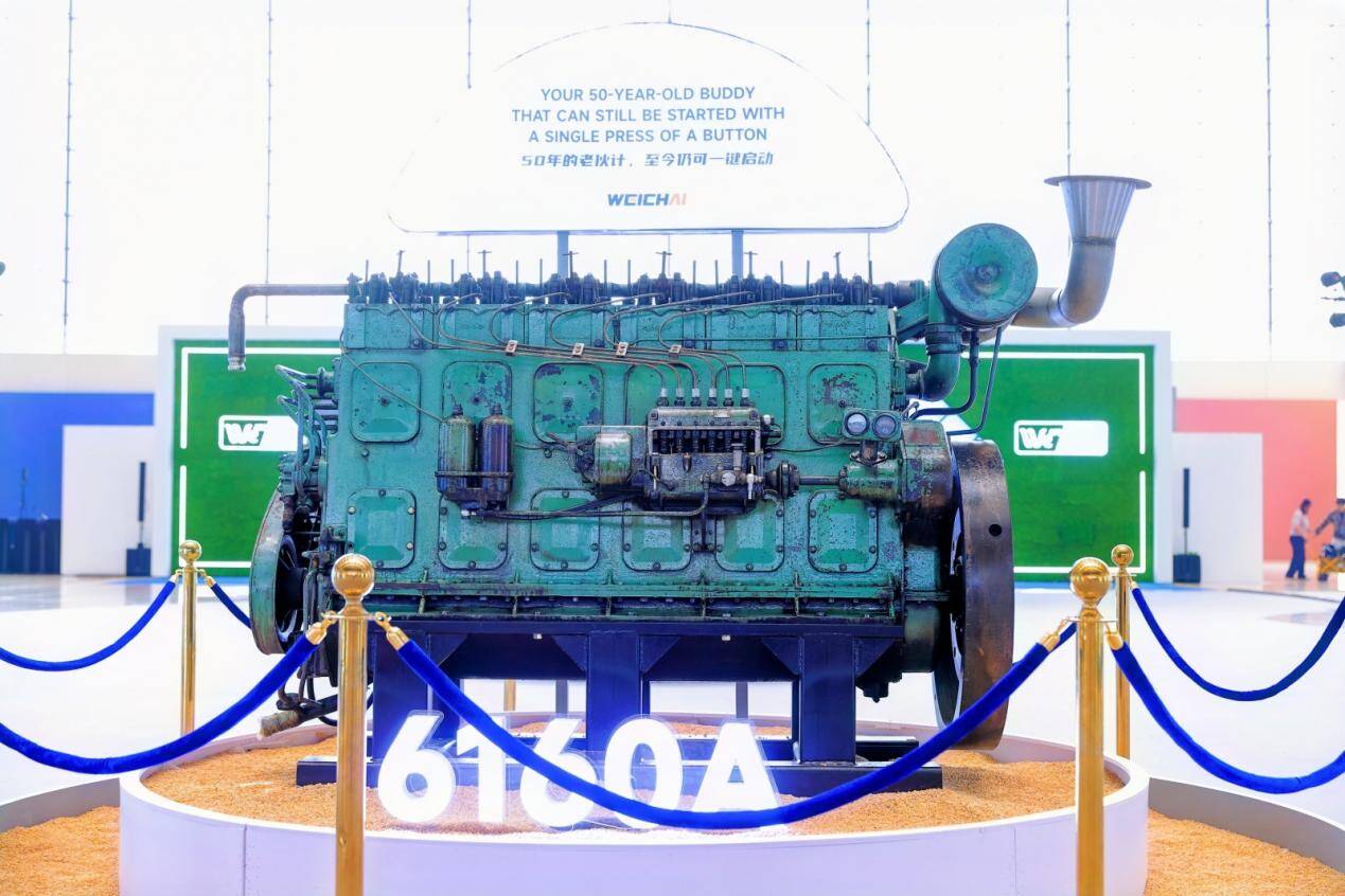 展会现场,两款刻满时光印记的机器傲然挺立,见证着潍柴品牌的厚重历史和产品技术的迭代突破。1976年3月生产的6160A柴油机已近50岁,上世纪70年代作为发电机组在山东临沂国营养殖场运行数十年,累计超10万小时。2017年“退休”重返潍柴后仍能一键启动,彰显老潍柴的品质底色。6160系列柴油机从投产到停产的60多年里,衍生出207个变型品种,累计生产近11万台,其中约1.2万台出口到越南、孟加拉、印尼等十几个国家,为潍柴在全球市场打下第一波口碑基础。