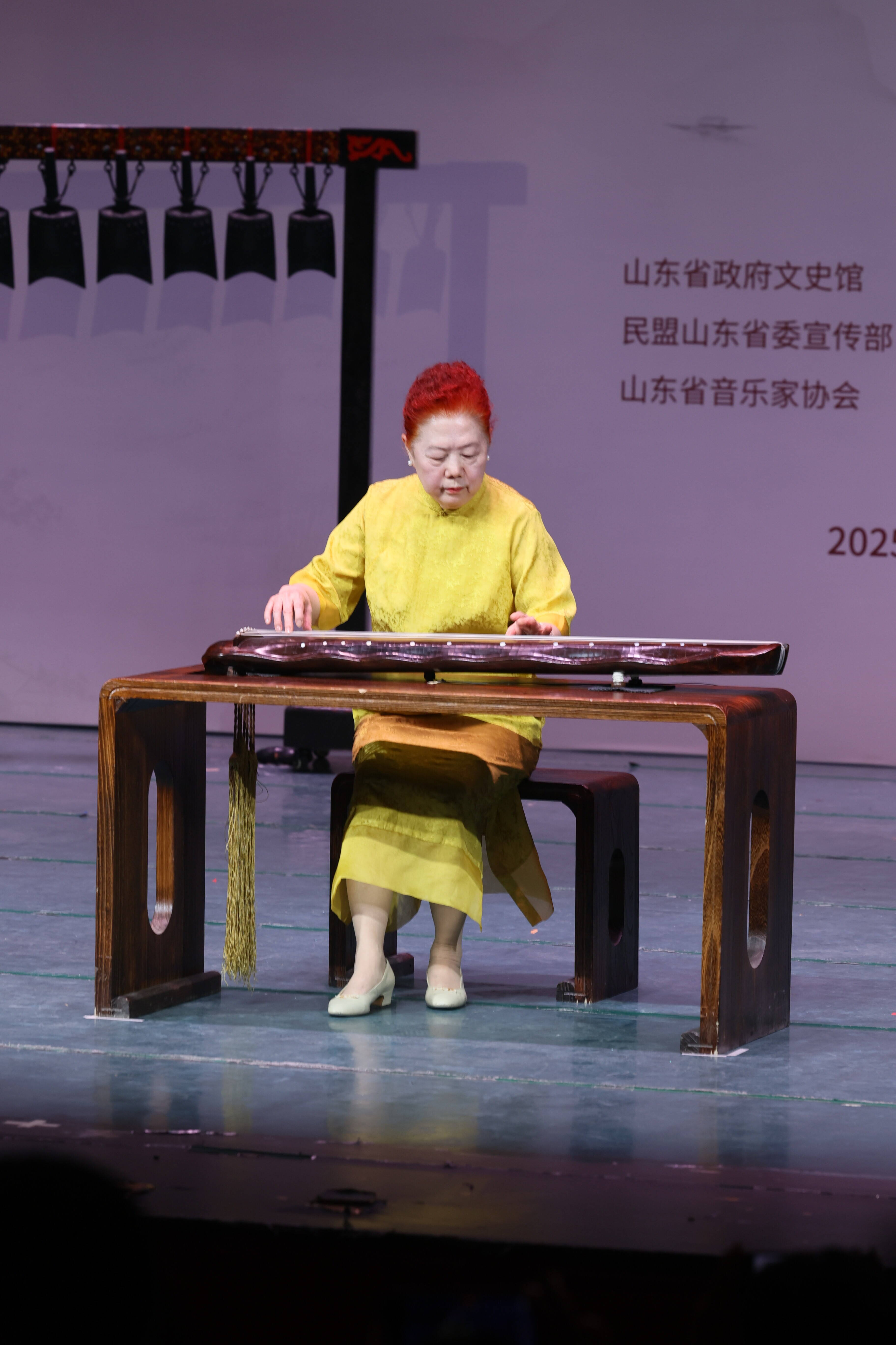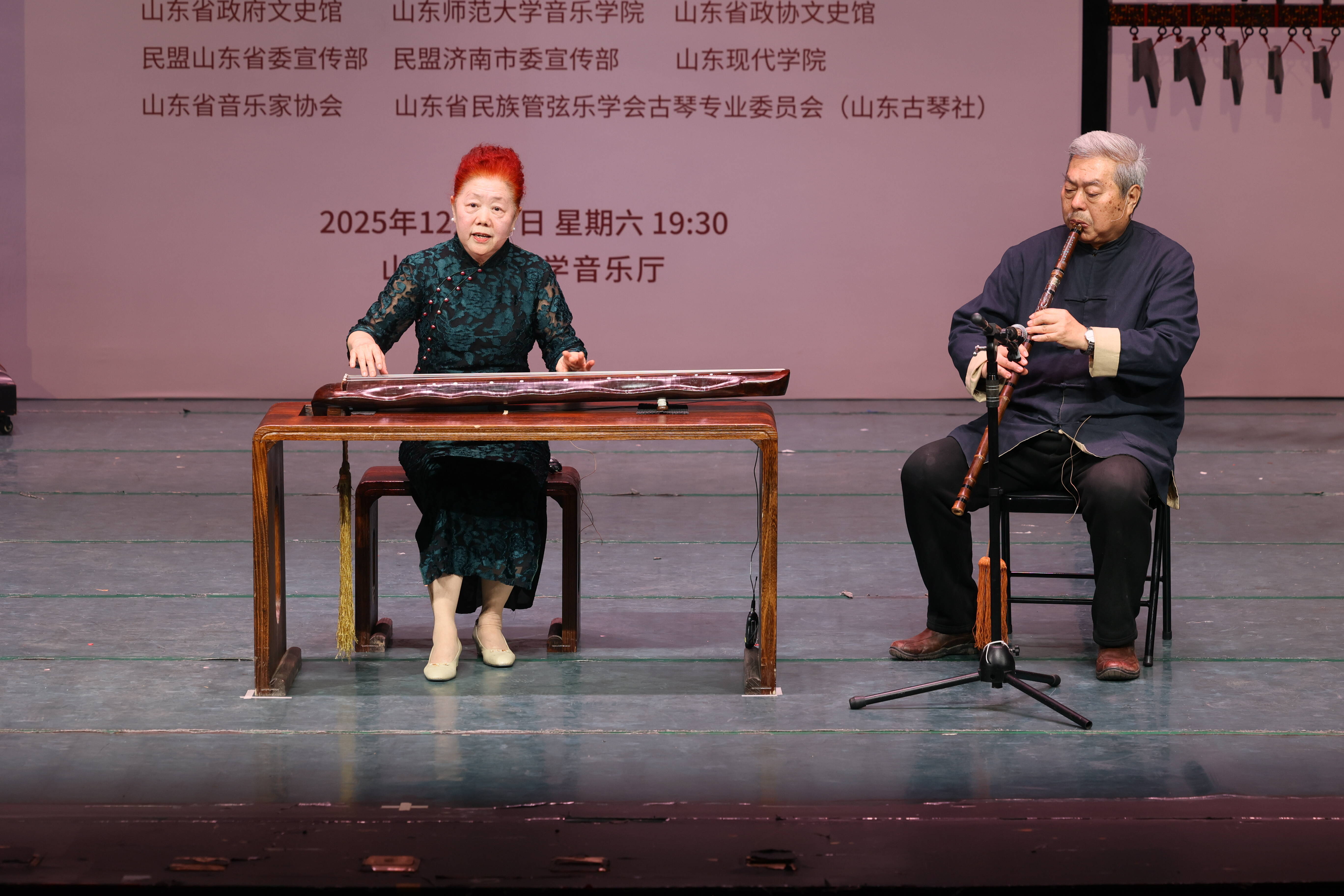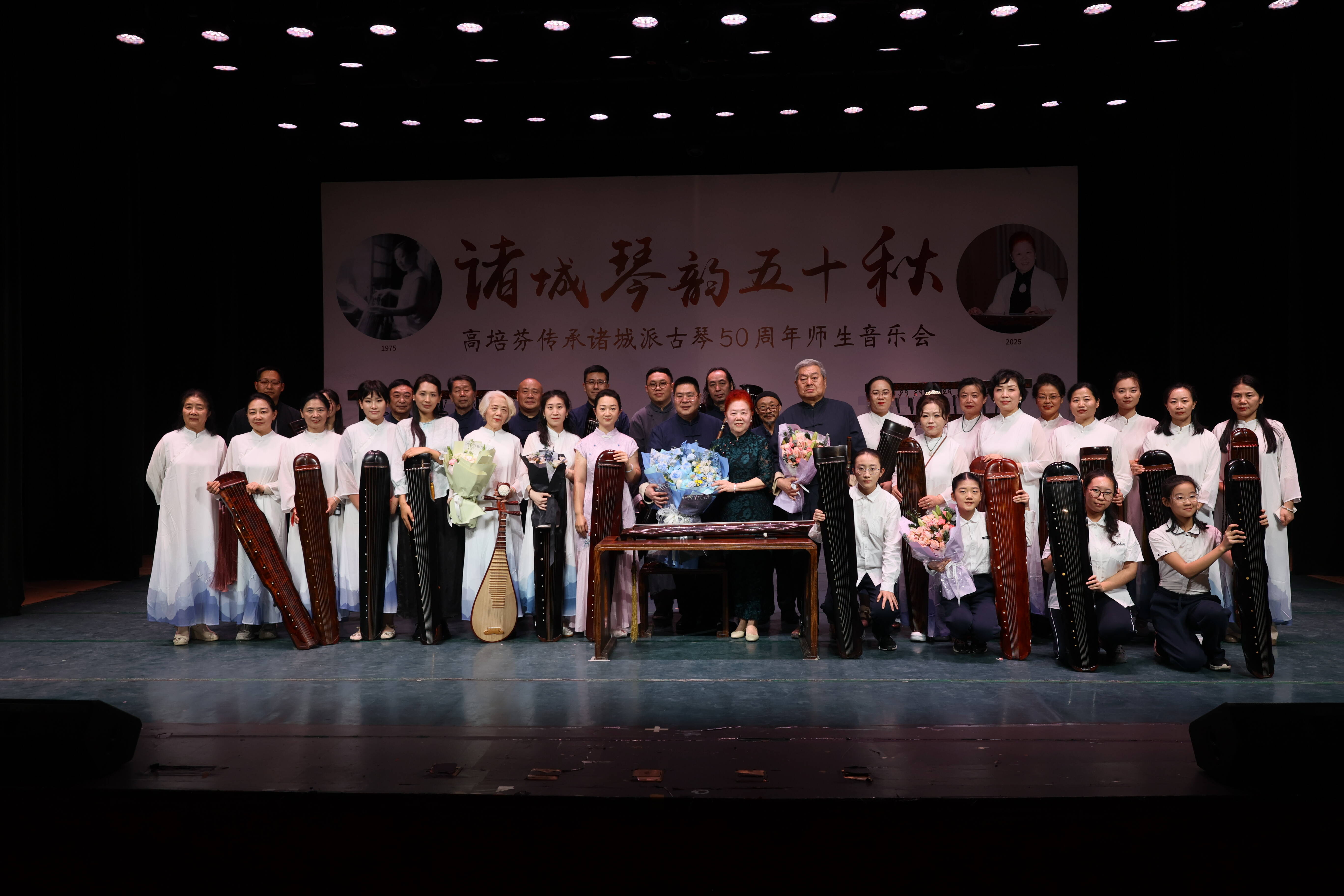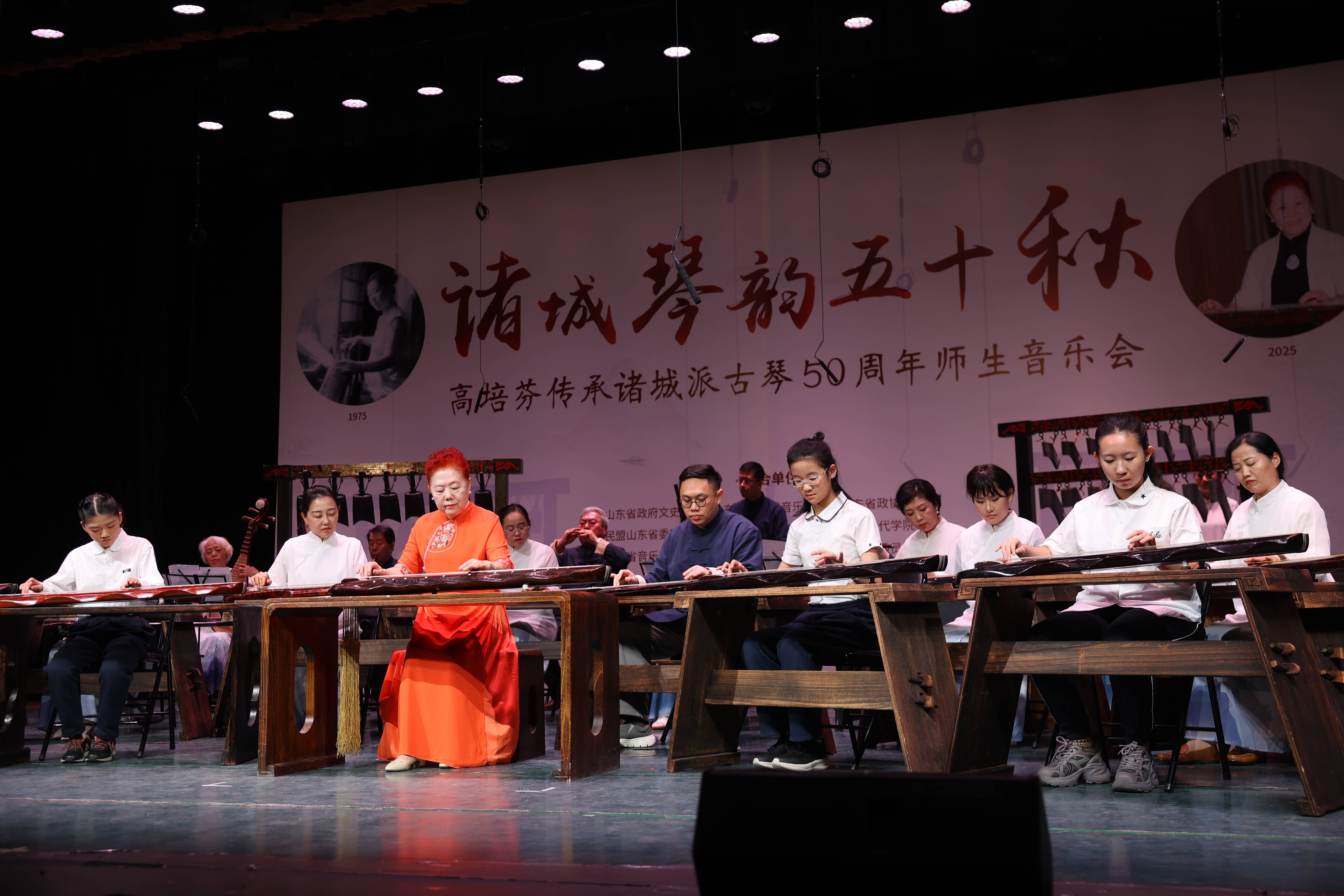 齐鲁网·闪电新闻12月28日讯 12月27日晚,伴随一曲古朴悠扬的《关山月》奏响,“诸城琴韵五十秋”——高培芬传承诸城派古琴50周年师生音乐会在山东师范大学(千佛山校区)音乐厅拉开帷幕。国家级非遗代表性项目诸城派古琴代表性传承人高培芬携30余名弟子同台献艺。