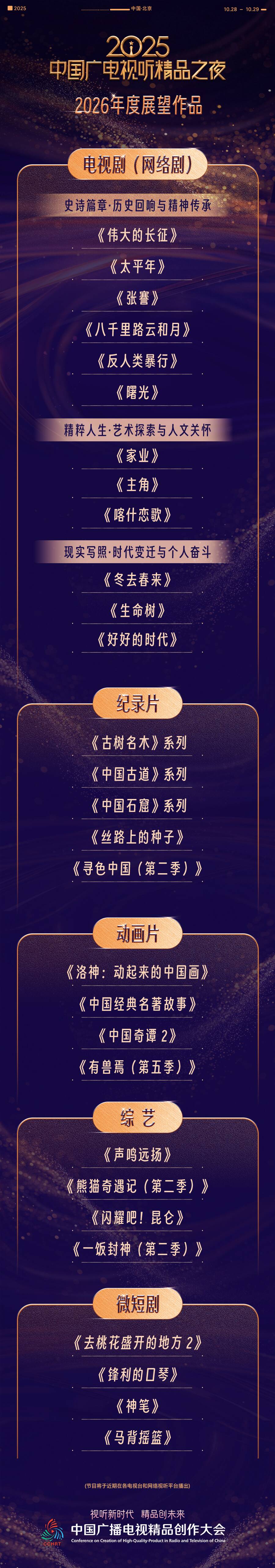 “2026年度展望作品”呈现出更加多元的精品创作视野。《伟大的长征》《太平年》等聚焦历史回响与精神传统;《家业》《主角》《喀什恋歌》等深耕艺术探索与人文关怀;《冬去春来》《生命树》《好好的时代》等讲述时代变迁与个人奋斗。同时,纪录片《古树名木》系列、动画片《中国奇谭2》、综艺《闪耀吧!昆仑》、微短剧《去桃花盛开的地方2》等作品,共同勾勒出未来广电视听行业蓬勃发展的新图景。
