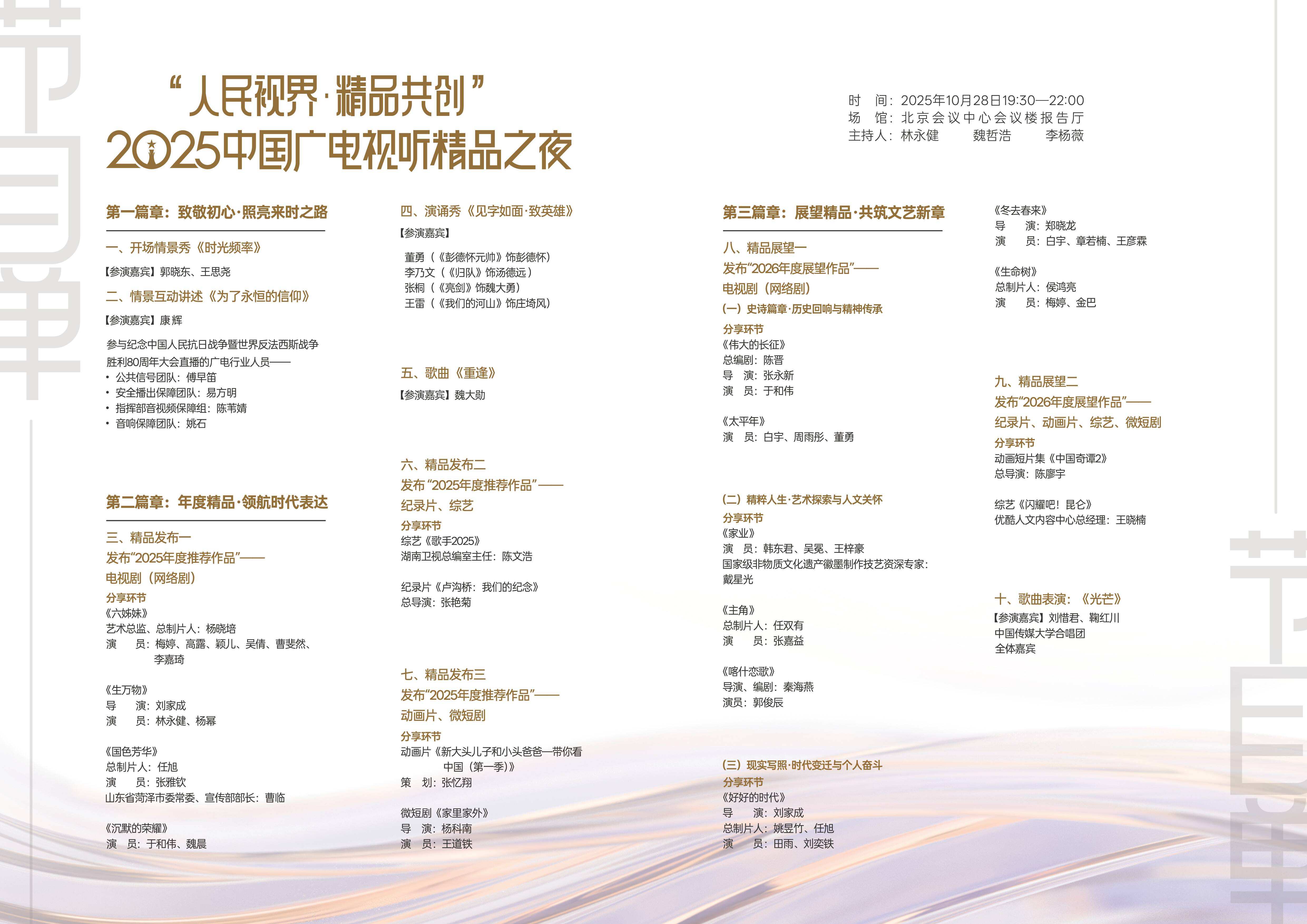 本次晚会由林永健、魏哲浩、李杨薇担任主持,集结老中青三代创作者与演员,通过真诚的创作分享和幕后故事,表达对艺术的执着追求与对时代的深刻思考。