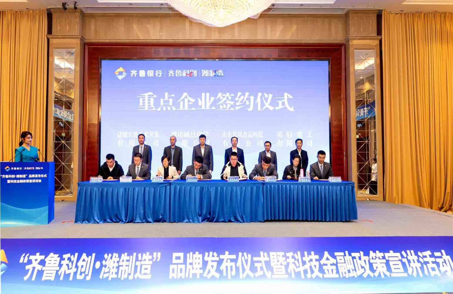 2025年11月6日,“齐鲁科创·潍制造”品牌发布会暨科技金融政策宣讲活动在潍坊富华国际会议中心成功举行。本次活动在潍坊市科学技术局、中国人民银行潍坊市分行指导下,由齐鲁银行潍坊分行主办,标志着潍坊市在政银协同、以金融创新驱动新质生产力发展方面迈出关键一步。潍坊市科学技术局局长杨德强、中国人民银行潍坊市分行副行长葛大江、潍坊市产业技术研究院执行副院长曹晓军、齐鲁银行副行长陶文喆等嘉宾出席,与百余家科技型企业代表共同见证品牌发布。会上,齐鲁银行潍坊分行辖内机构分别与10家重点科技型企业现场签署了合作协议,实现了金融资源与产业需求的“零时差”对接。