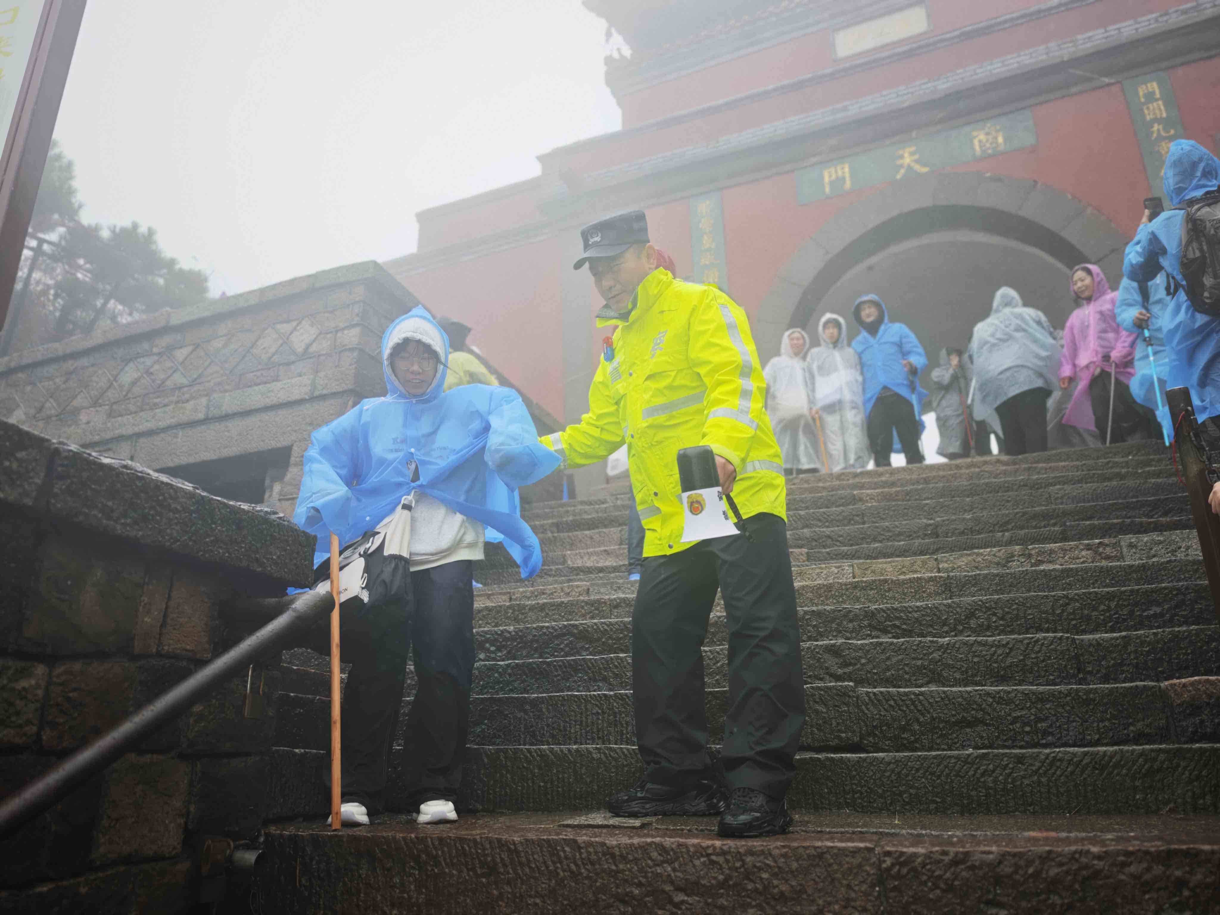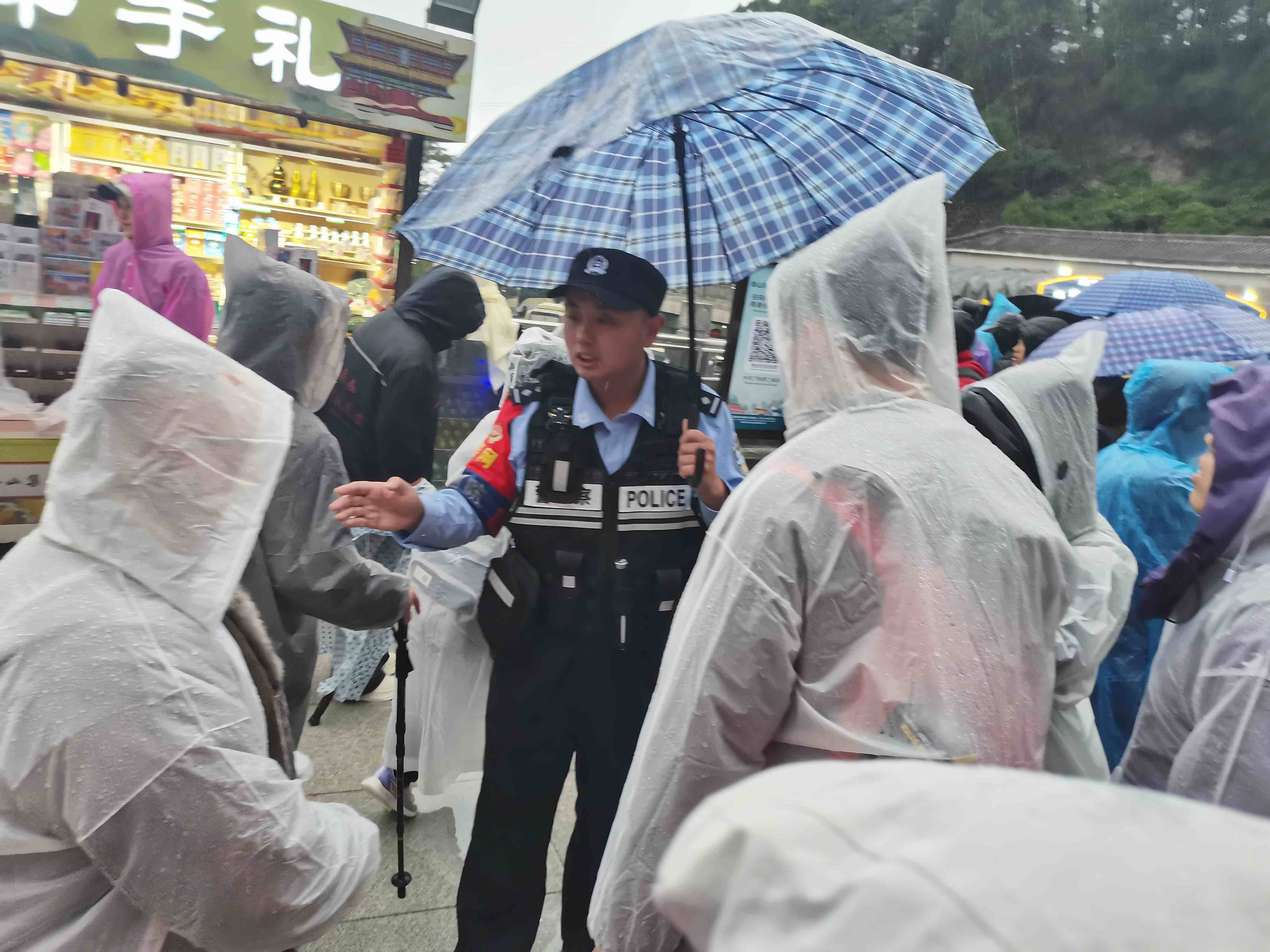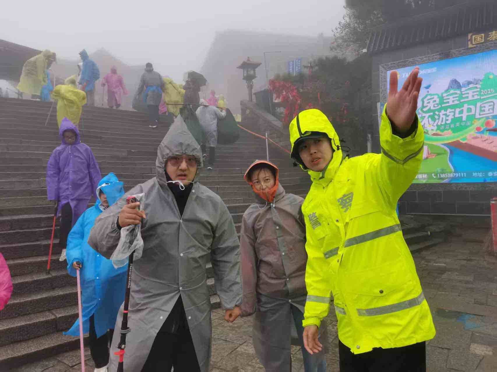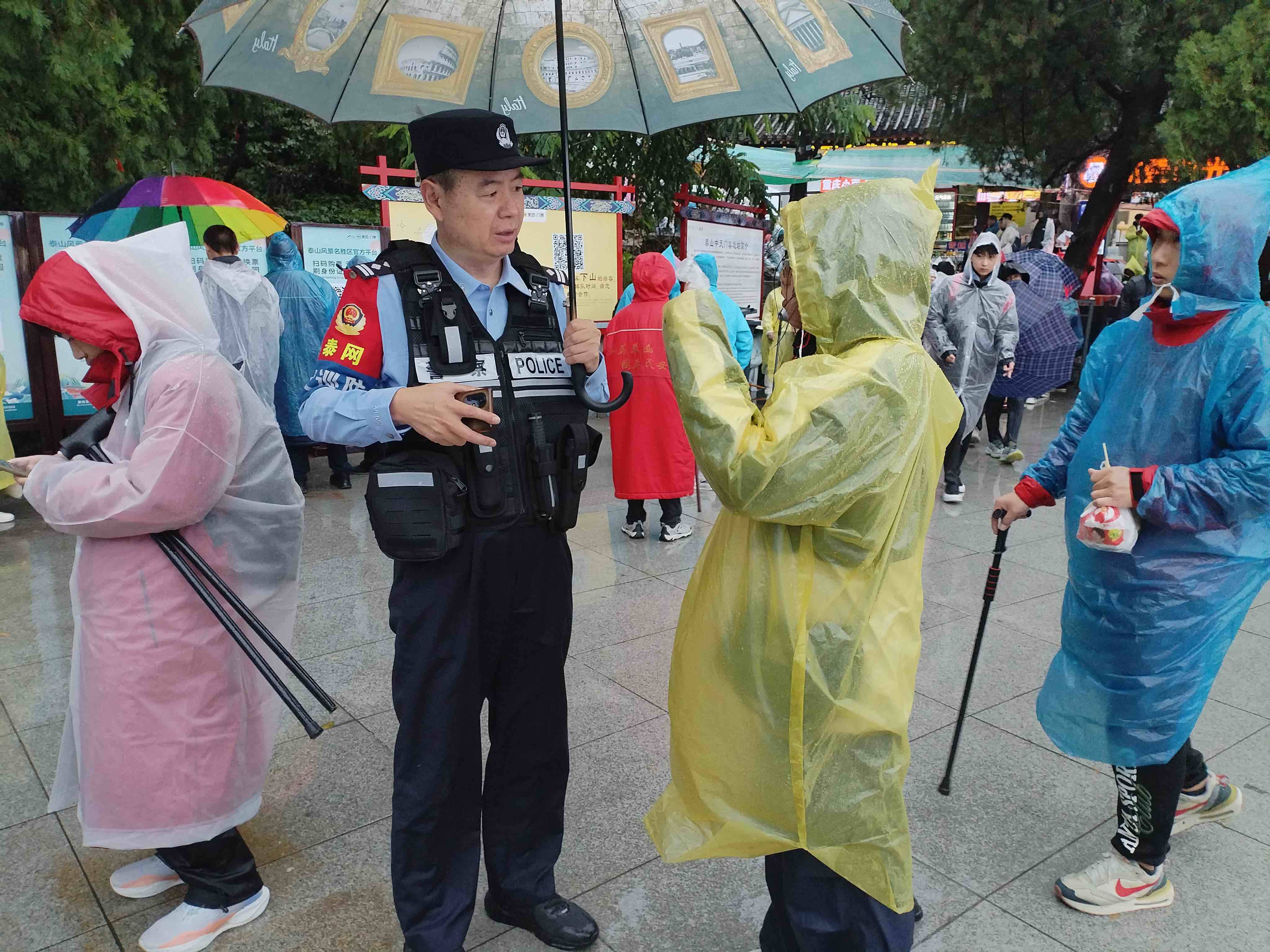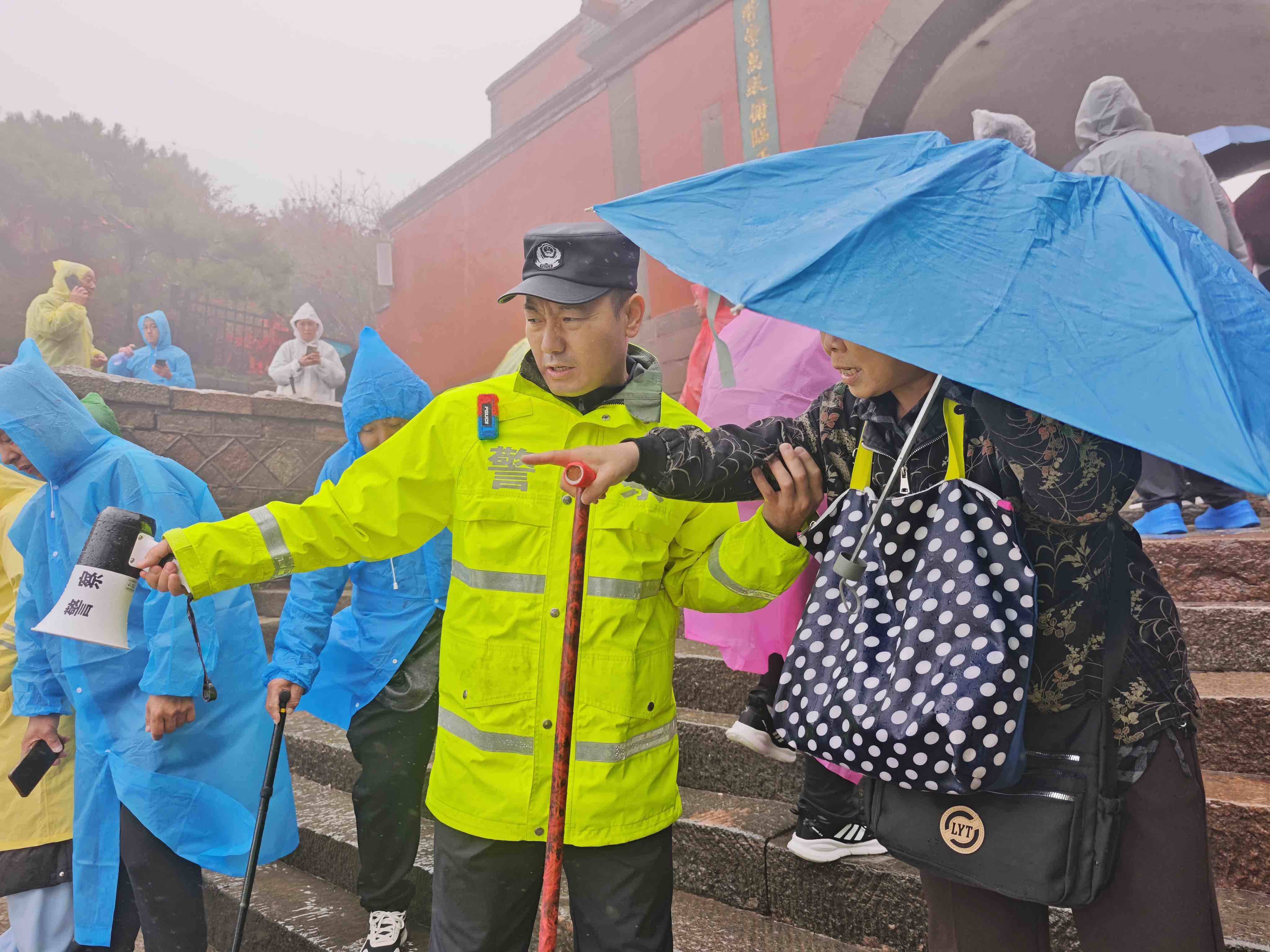 齐鲁网·闪电新闻10月2日讯 10月2日,泰山景区遭遇风雨天气,泰安市公安局泰山景区分局岱顶派出所民警冒雨执勤,快速引导游客至景区紧急避险场所,为下山游客指引下山路线,同时加密十八盘、南天门等重点路段巡逻频次,及时分流扎堆游客,全力守护辖区秩序井然。