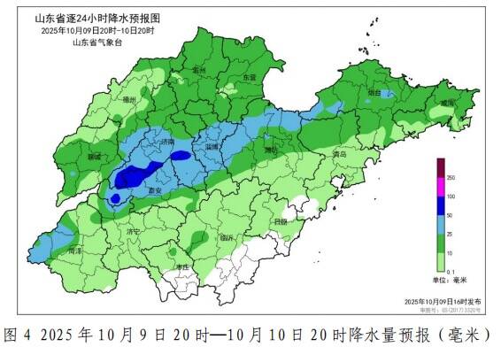 10月8日12时至9日16时,全省共有13市、92县(市、区)、1444乡镇出现降水,平均降水量8.2,折合水量约12.9亿方(图3)。各市平均:滨州30.6、德州29.3、东营27.9、济南15.1、聊城12.9、淄博8.1、泰安3.9、潍坊2.7、菏泽2.0、济宁1.1和烟台1.0,其他市降水量不足1.0或无降水。县(市、区)平均降水量超过25.0的18个,10.0—25.0的20个,5.0—10.0的11个,前3位的是:滨州阳信40.6、德州陵城38.9和滨州无棣38.3。所有站点超过50.0的 1 个站,25.0—50.0的278个,10.0—25.0的351个,降水量前3位的是:滨州无棣埕口54.2、德州翟家49.1和滨州阳信水落坡48.5(水文站)