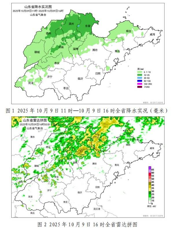 各市平均:东营14.2、滨州12.4、德州8.2、济南6.5、淄博3.2和聊城1.3,其他市降水量不足1.0或无降水。县(市、区)平均降水量超过10.0的17个,5.0—10.0的9个,1.0—5.0的23个,前3位的是:东营利津18.7、东营垦利17.7和滨州阳信16.8。所有站点超过25.0的2个站,10.0—25.0的252个,5.0—10.0的189个,降水量前3位的是:东营利津明集26.5(水文站)、东营利津盐窝26.5(水文站)和东营利津陈庄23.7。目前,降水回波主要位于聊城、德州、泰安、济南、滨州、淄博、东营和潍坊(图2)。