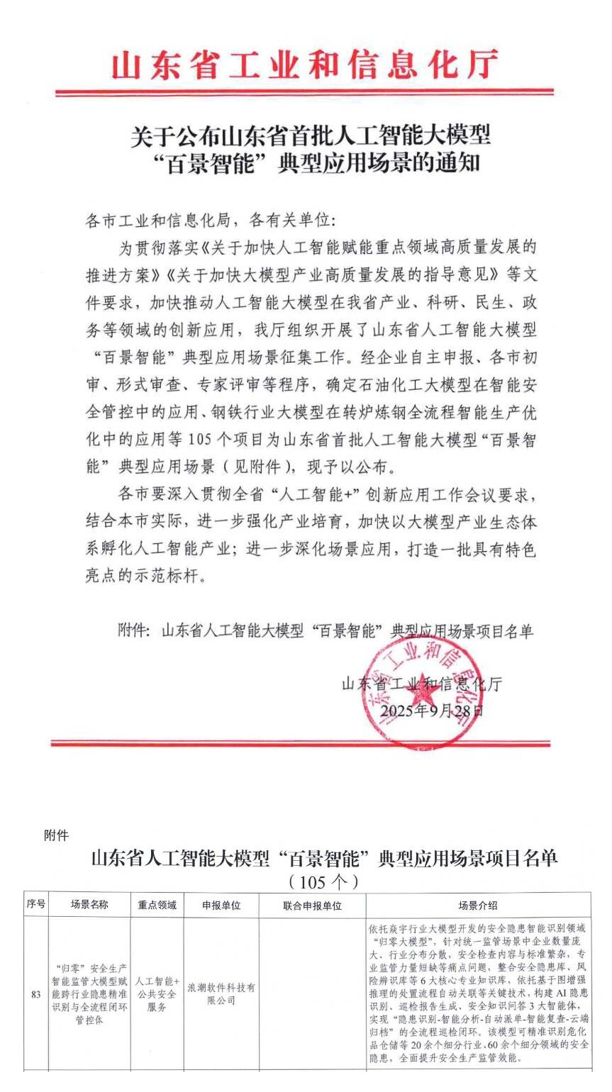 齐鲁网·闪电新闻10月10日讯 近日,山东省工业和信息化厅公布了全省首批人工智能大模型“百景智能”典型应用场景名单。浪潮科技打造的“归零”安全生产智能监管大模型(简称:浪潮应急归零大模型)成功入选“人工智能+公共安全服务”重点领域场景。