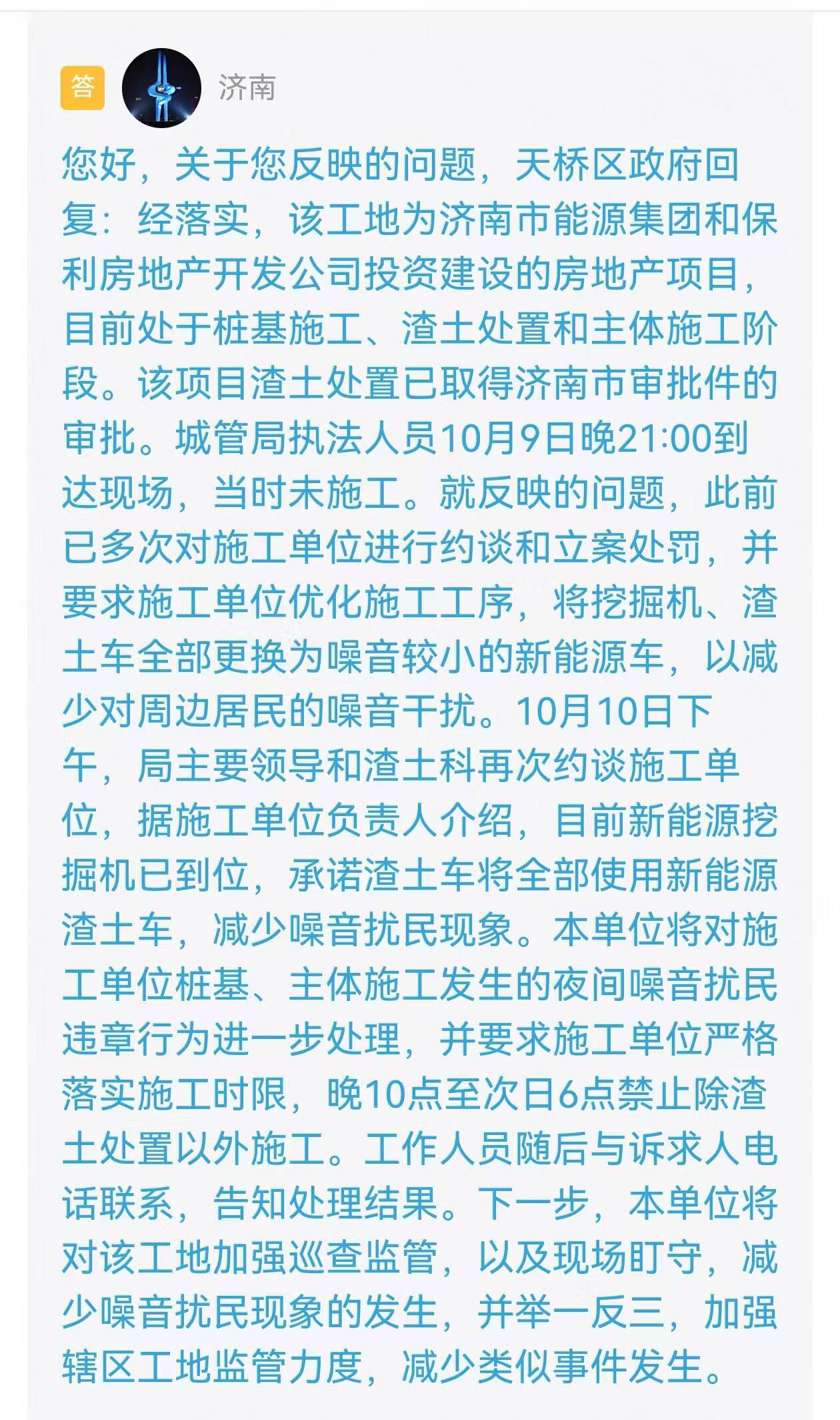 收到留言后,济南市进行了办理并回复:经落实,该工地为济南市能源集团和保利房地产开发公司投资建设的房地产项目,目前处于桩基施工、渣土处置和主体施工阶段。