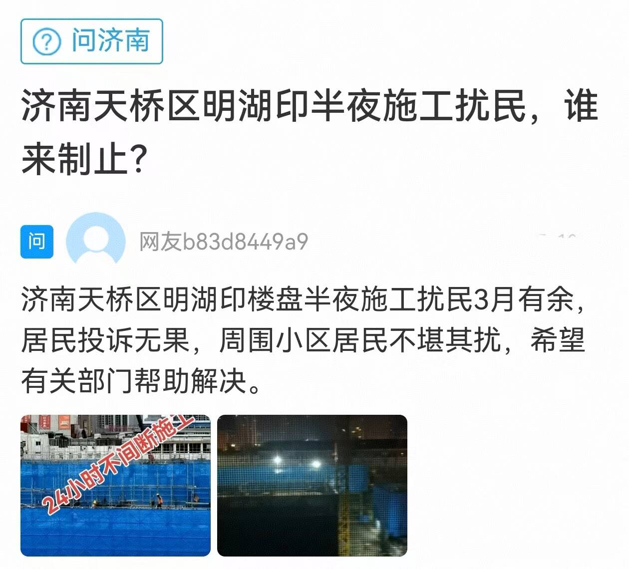齐鲁网·闪电新闻11月5日讯 济南的一位网友在闪电新闻网络问政平台留言:天桥区明湖印楼盘半夜施工扰民3月有余,居民投诉无果,周围小区居民不堪其扰。希望有关部门帮助解决。