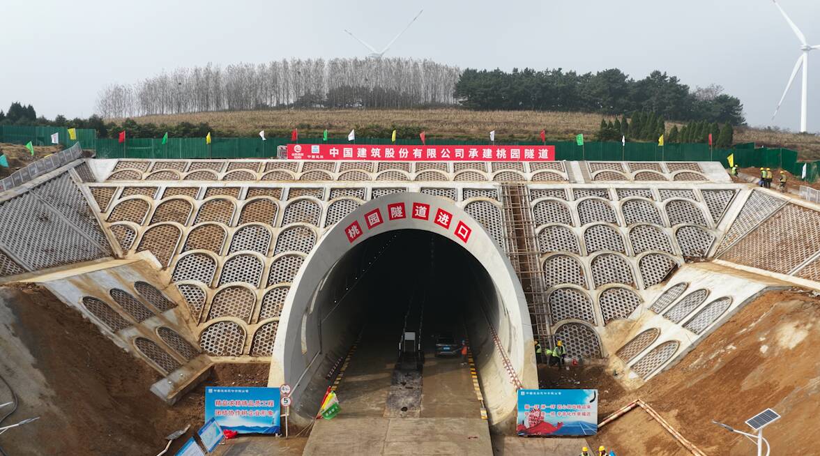 桃园隧道位于站前施工三标,该标段由中国建筑股份有限公司承建。隧道全长940米,V级围岩占比高达88.3%,最大埋深37.33米,最小埋深仅4.73米,下穿110kV高压电塔及2条地方道路,距离最近的风力发电机仅50米,周边环境复杂、对施工振动控制要求高,如同在“水豆腐里打洞”,施工技术难度大、安全环保要求高。