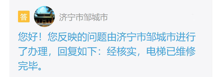 收到留言后,邹城市进行了办理并回复:经核实,电梯已维修完毕。