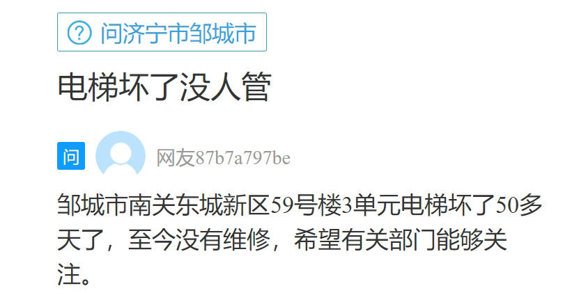 齐鲁网·闪电新闻11月14日讯 济宁的一位网友在闪电新闻网络问政平台留言:邹城市南关东城新区59号楼3单元电梯坏了50多天了,至今没有维修,希望有关部门能够关注。