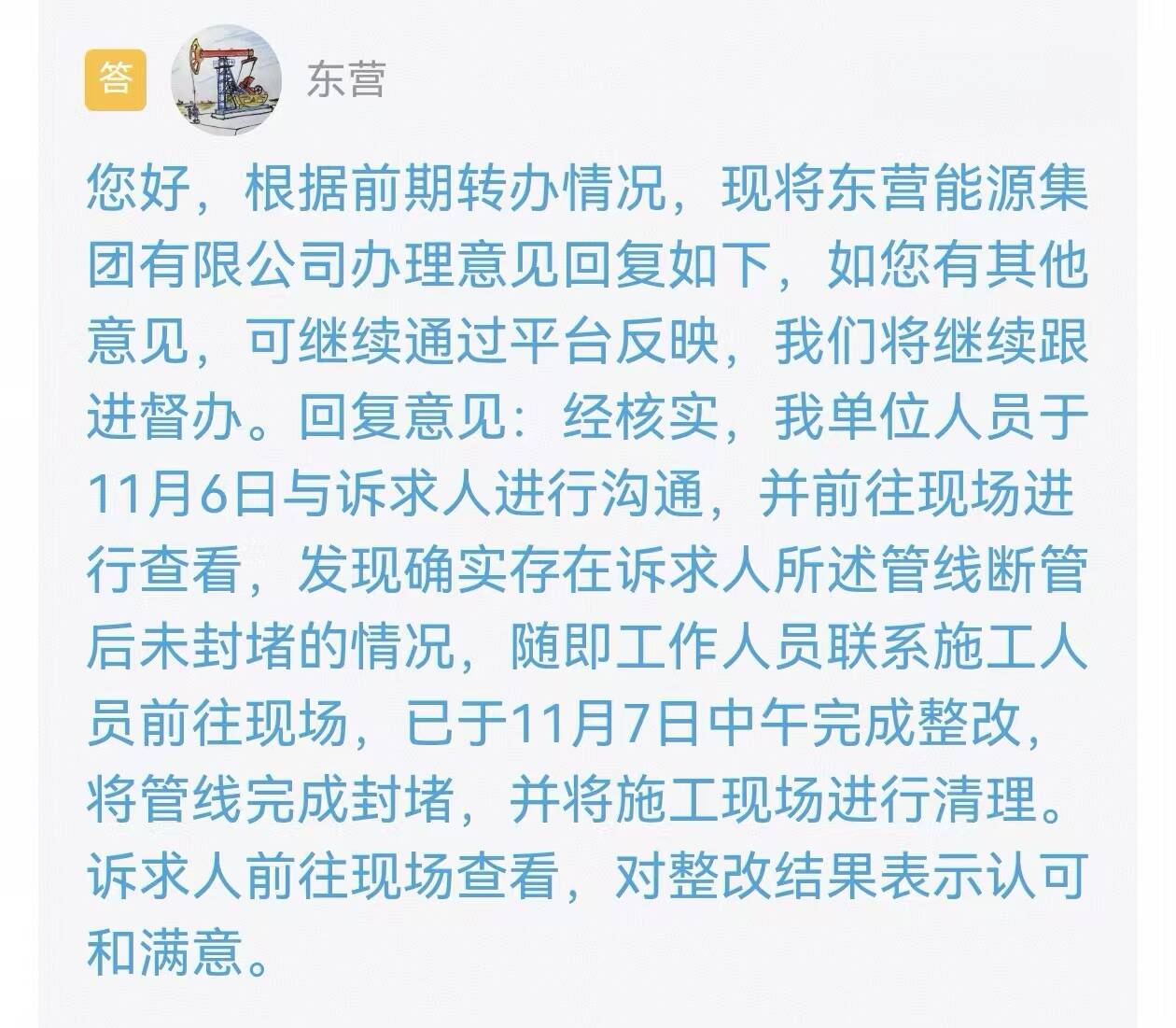 收到留言后,东营市能源集团有限公司进行了办理并回复:经核实,我单位人员于11月6日与诉求人进行沟通,并前往现场进行查看,发现确实存在诉求人所述管线断管后未封堵的情况。随即工作人员联系施工人员前往现场,已于11月7日中午完成整改,将管线完成封堵,并将施工现场进行清理。诉求人前往现场查看,对整改结果表示认可和满意。