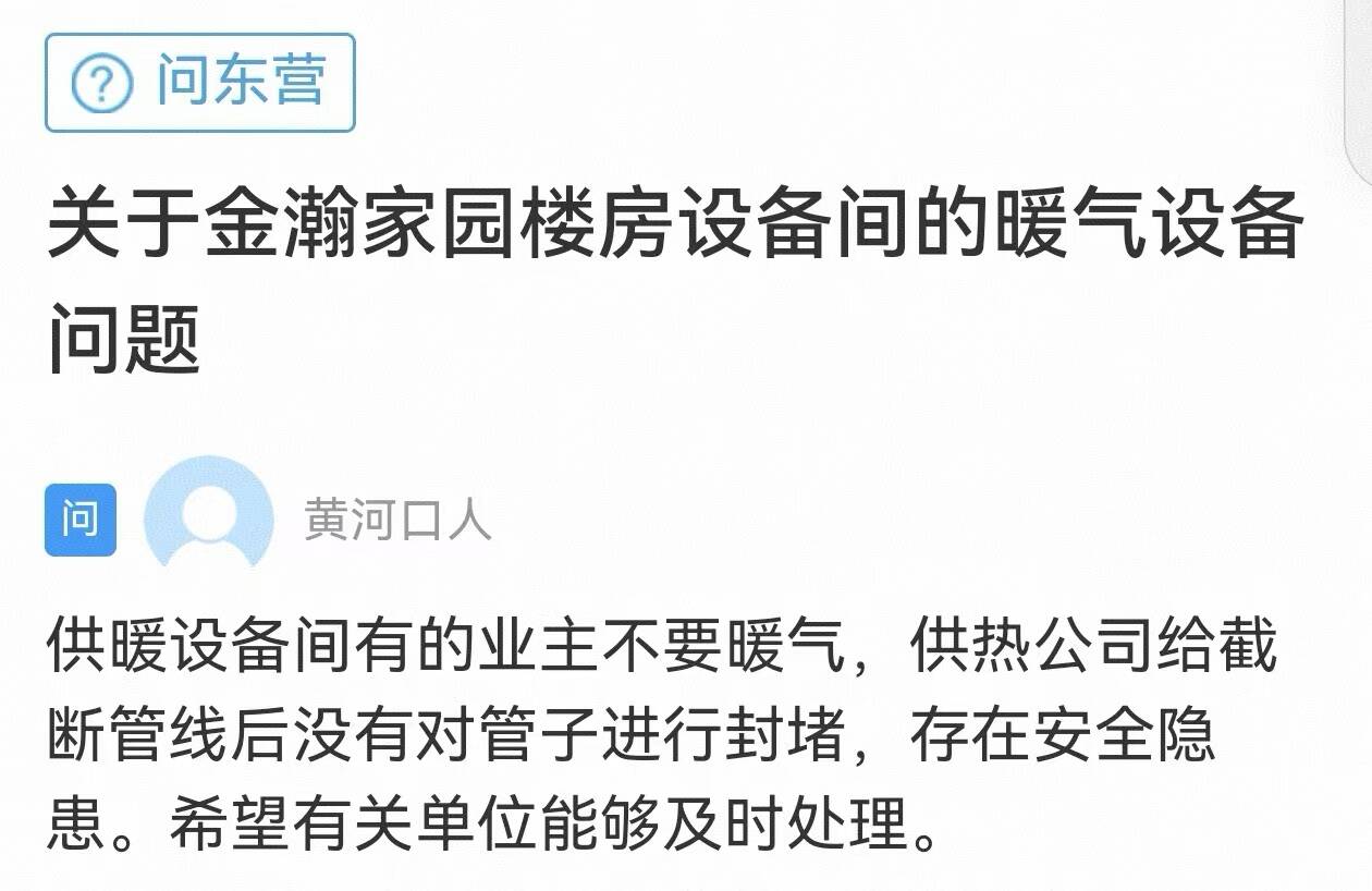 齐鲁网·闪电新闻11月18日讯 东营的一位网友在闪电新闻网络问政平台留言:供暖设备间有的业主不要暖气,供热公司给截断管线后没有对管子进行封堵,存在安全隐患。希望有关单位能够及时处理。