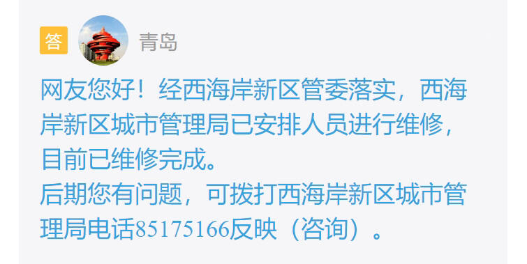 收到留言后,青岛市进行了办理并回复:经西海岸新区管委落实,西海岸新区城市管理局已安排人员进行维修,目前已维修完成。