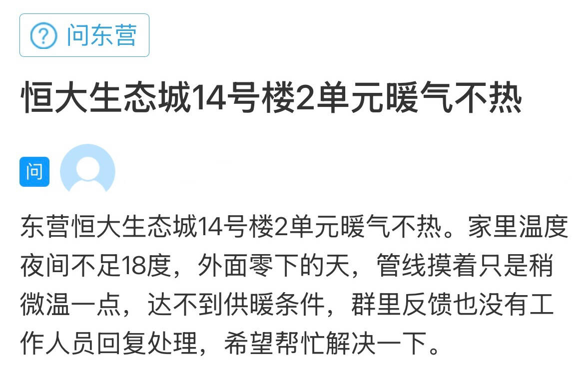 齐鲁网·闪电新闻11月28日讯 东营的一位网友在闪电新闻网络问政平台留言:东营经济技术开发区恒大生态城14号楼2单元暖气不热。家里温度夜间不足18度,外面零下的天,管线摸着只是稍微温一点,达不到供暖条件。在群里反映,也没有工作人员回复处理。希望帮忙解决。