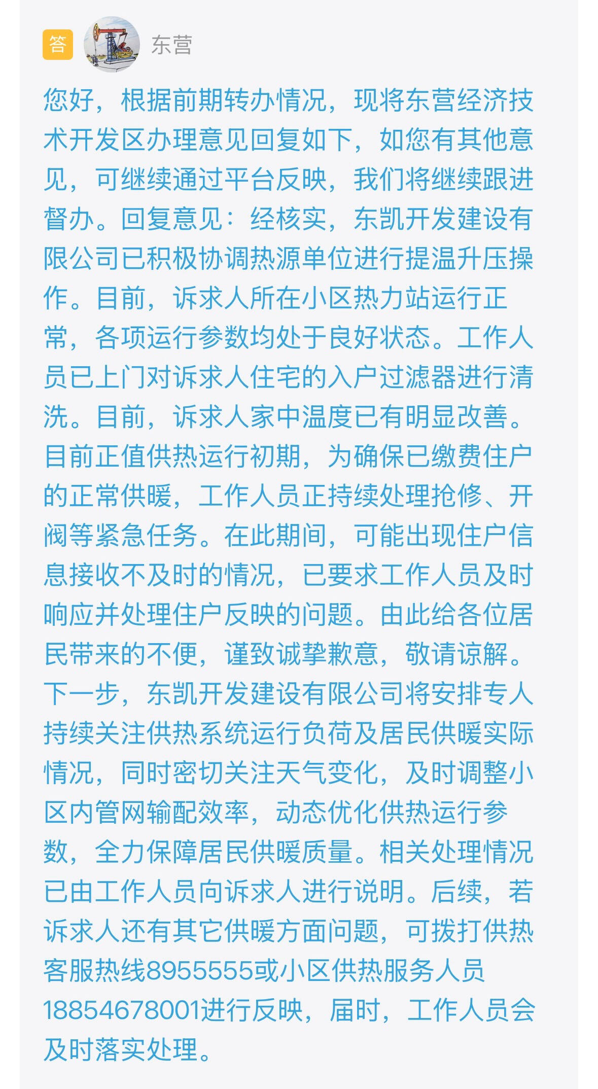 收到留言后,东营经济技术开发区进行了办理并回复:经核实,东凯开发建设有限公司已积极协调热源单位进行提温升压操作。目前,诉求人所在小区热力站运行正常,各项运行参数均处于良好状态。工作人员已上门对诉求人住宅的入户过滤器进行清洗,诉求人家中温度已有明显改善。目前正值供热运行初期,为确保已缴费住户的正常供暖,工作人员正持续处理抢修、开阀等紧急任务。在此期间,可能出现住户信息接收不及时的情况,已要求工作人员及时响应并处理住户反映的问题。由此给各位居民带来的不便,谨致诚挚歉意,敬请谅解。下一步,东凯开发建设有限公司将安排专人持续关注供热系统运行负荷及居民供暖实际情况,同时密切关注天气变化,及时调整小区内管网输配效率,动态优化供热运行参数,全力保障居民供暖质量。