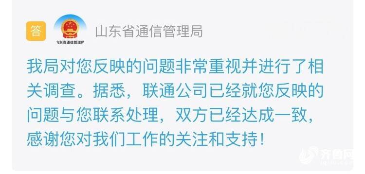 收到留言后,山东省通信管理局进行了办理并回复:联通公司已经就反映的问题与网友联系处理,双方已经达成一致。