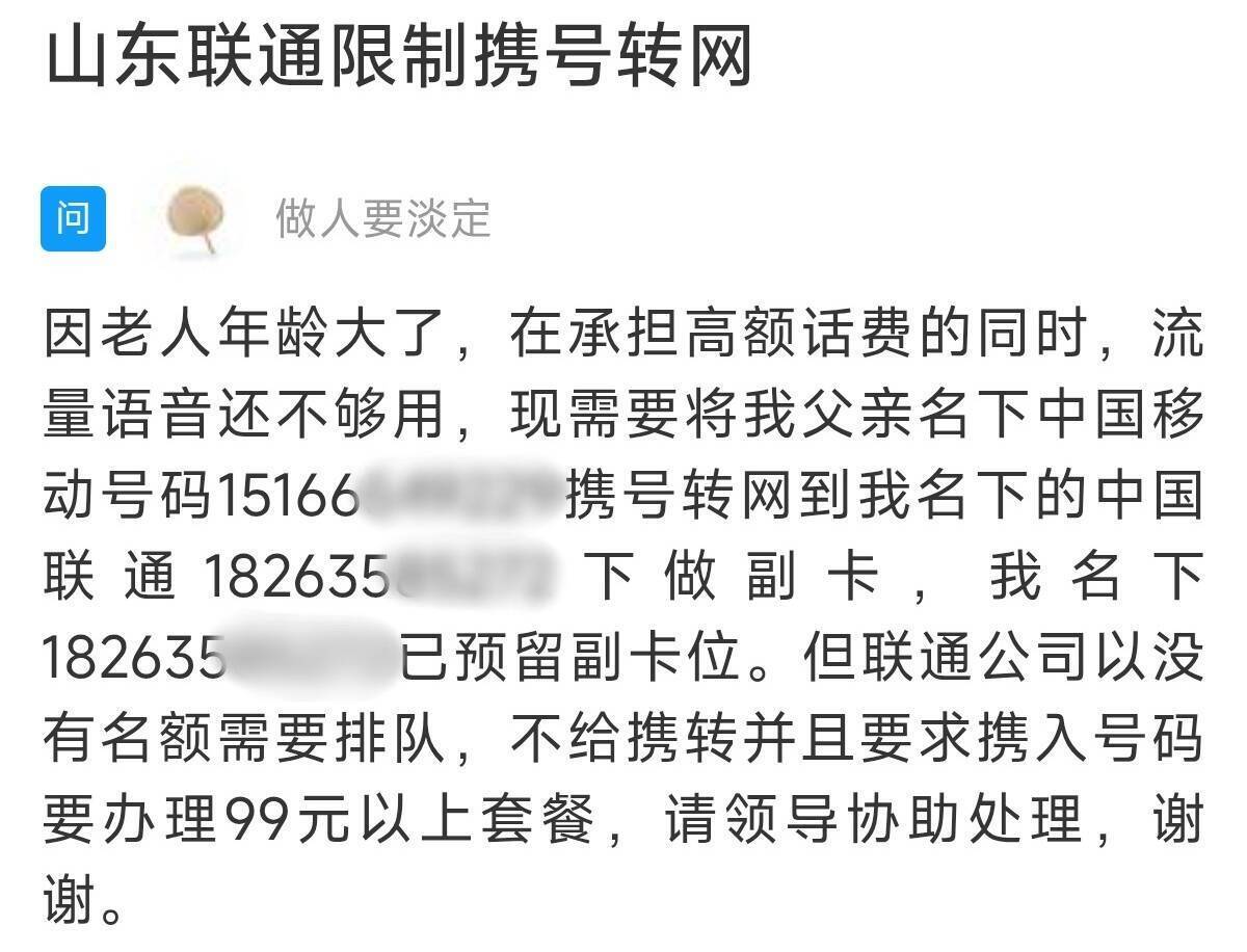 齐鲁网·闪电新闻12月1日讯 一位网友在闪电新闻网络问政平台留言:他的父亲有一个移动手机号,现在想携号转网到自己名下的联通手机号做副卡。在一个月的时间内,他父亲去了三次联通营业厅。联通营业厅答复:没有名额需要排队,且携入号码需要办理99元以上套餐。希望有关部门能尽快帮助解决。