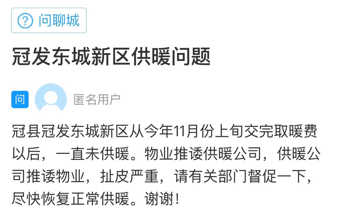 齐鲁网·闪电新闻12月7日讯 聊城的一位网友在闪电新闻网络问政平台留言:冠县冠发东城新区从今年11月份上旬交完取暖费以后,一直未供暖。物业和供暖公司相互推诿,请有关部门督促解决。