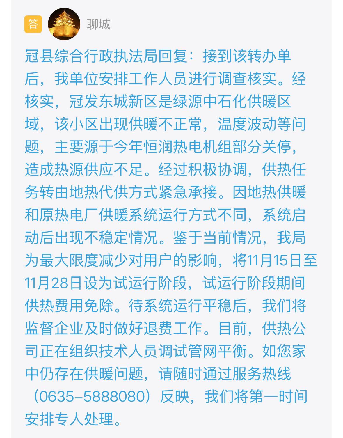 收到留言后,冠县综合行政执法局进行了办理并回复:经核实,冠发东城新区是绿源中石化供暖区域。该小区出现供暖不正常,温度波动等问题,主要源于今年恒润热电机组部分关停,造成热源供应不足。经过积极协调,供热任务转由地热代供方式紧急承接。因地热供暖和原热电厂供暖系统运行方式不同,系统启动后出现不稳定情况。为最大限度减少对用户的影响,11月15日至11月28日设为试运行阶段,试运行阶段期间供热费用免除。