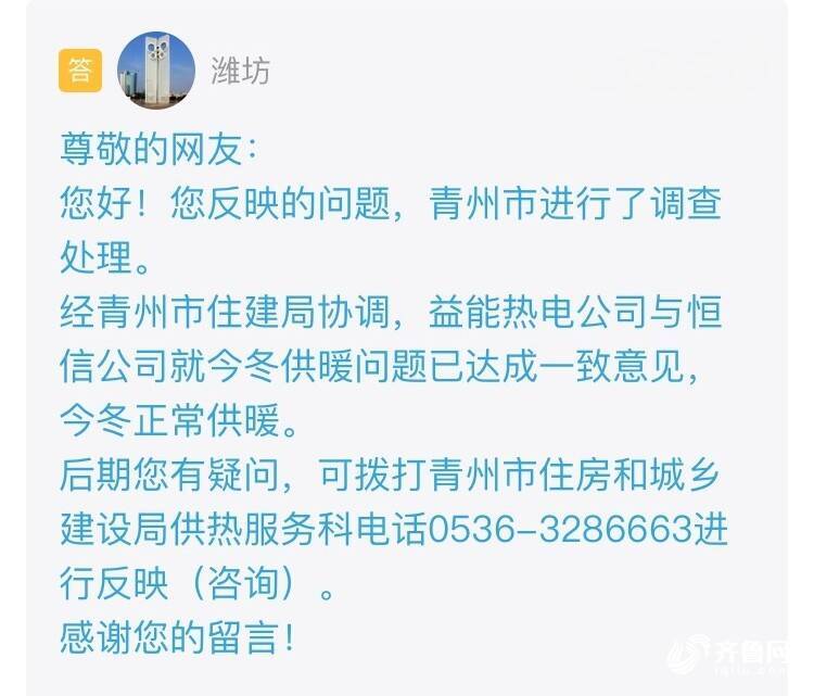 收到留言后,青州市进行了办理并回复:经青州市住建局协调,益能热电公司与恒信公司就今冬供暖问题已达成一致意见,今冬正常供暖。