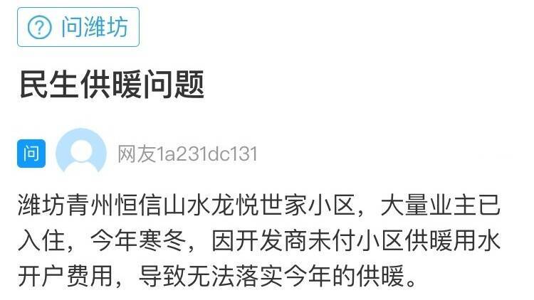齐鲁网·闪电新闻12月9日讯 一位潍坊网友在闪电新闻网络问政平台留言说:他是青州恒信山水龙悦世家小区的一位业主。目前,大量业主已入住该小区。今年寒冬,因为开发商未付小区供暖用水开户费,供暖可能无法落实。希望相关部门协调解决。