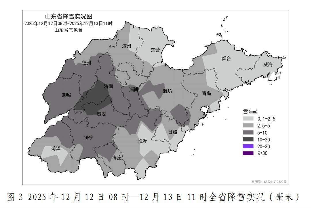 各市平均降雪量:泰安9.5、济南9.2、聊城7.6、济宁5.9、德州5.3、淄博4.9、潍坊4.4、枣庄4.2、菏泽3.9、滨州3.4、临沂3.2、青岛2.8、东营2.5、日照2.3、烟台2.1和威海0.6。县(市、区)平均降雪量超过10.0的5个,5.0—10.0的44个,2.5—5.0的46个,前3位的是:泰安泰山15.6、济南市区13.6和济南长清12.6。最大积雪深度排前3位的是:济南长清16厘米、泰安泰山12厘米和济南本站11厘米。