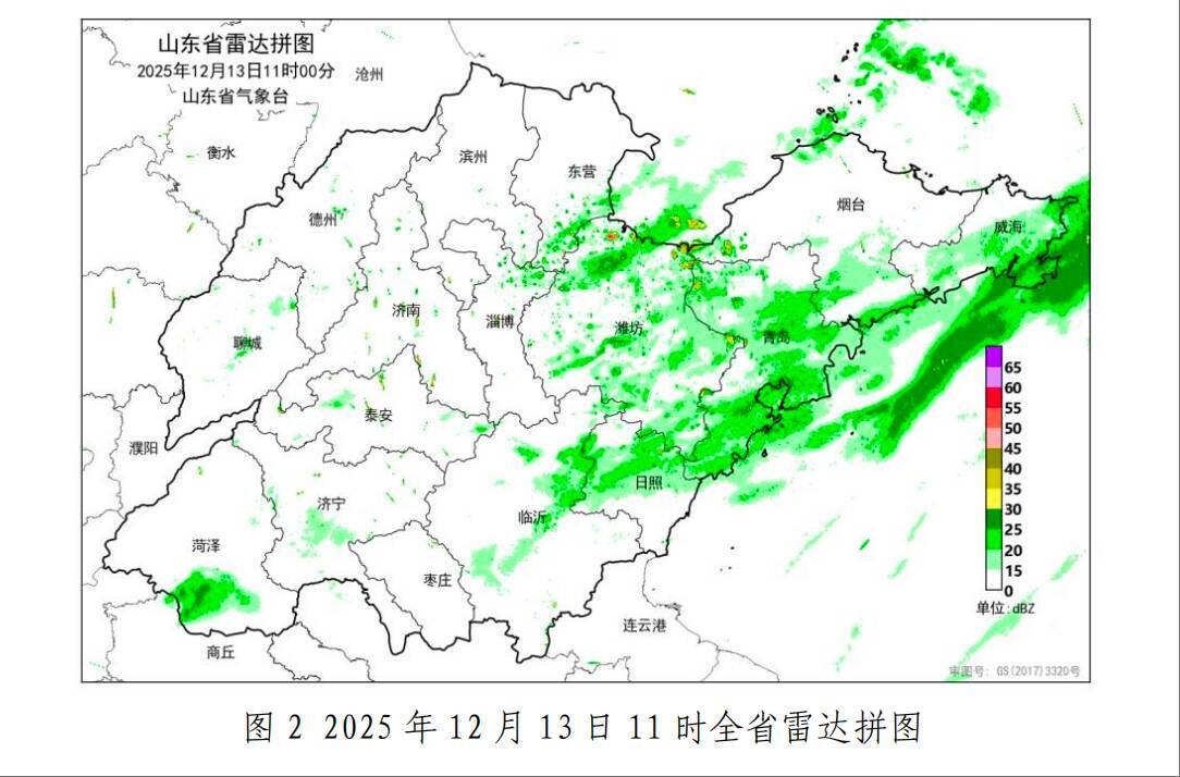 13日11时,山东省气象台道路结冰橙色预警、寒潮蓝色预警生效中;淄博市暴雪蓝色预警生效中;济南市、青岛市、淄博市、枣庄市、潍坊市、济宁市、泰安市、临沂市、德州市、聊城市、滨州市、菏泽市寒潮蓝色预警生效中;青岛市大风黄色预警生效中;潍坊市道路结冰橙色预警生效中,济南市、青岛市、淄博市、东营市、烟台市、济宁市、泰安市、威海市、日照市、临沂市、德州市、聊城市、滨州市、菏泽市道路结冰黄色预警生效中。目前,降水回波主要位于潍坊、日照和半岛地区。