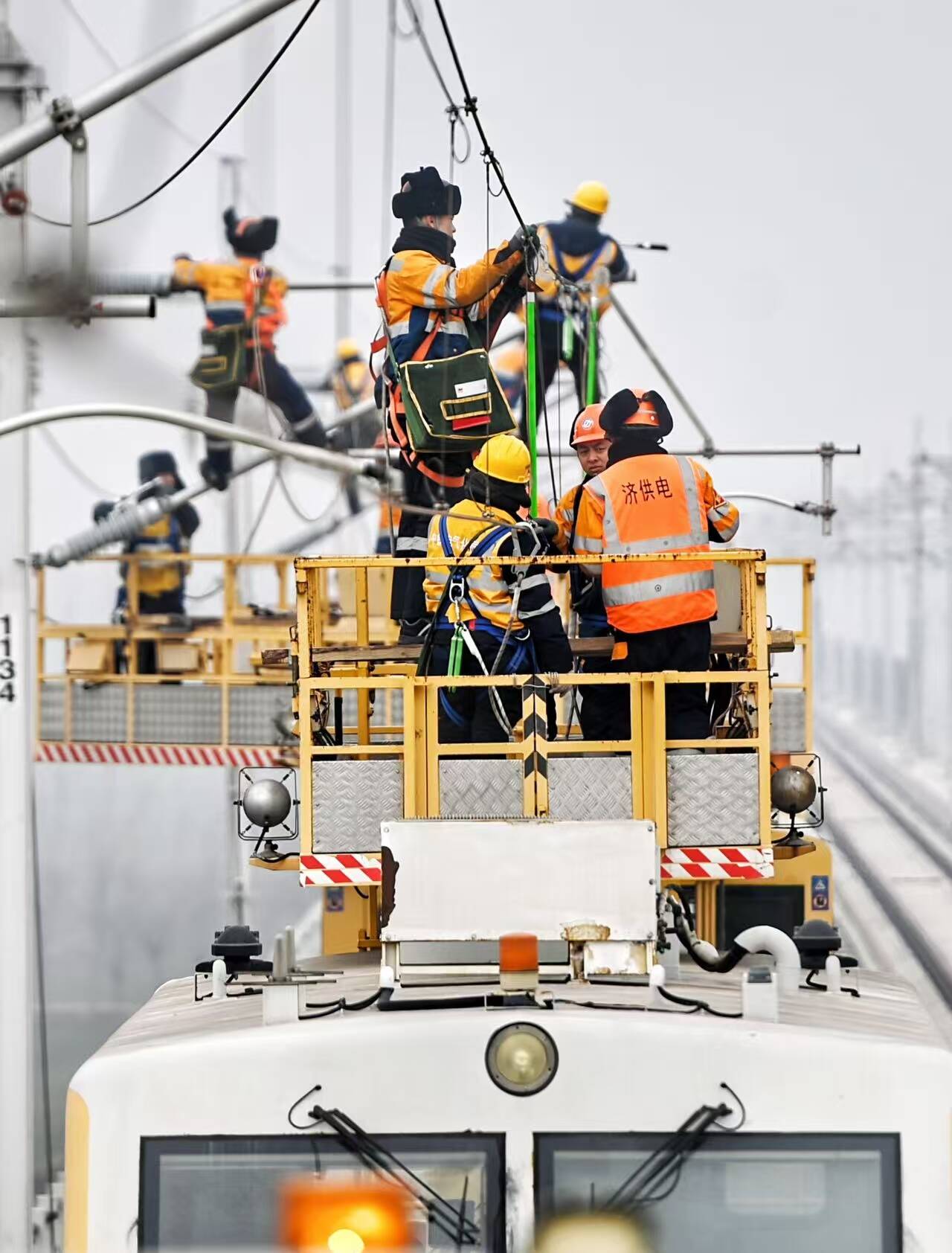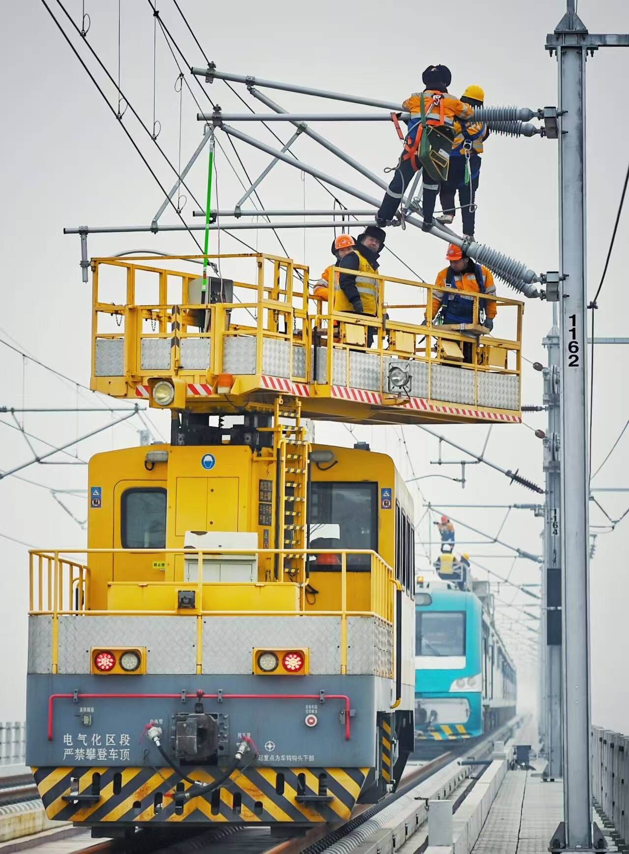 这列全长228米、由2台牵引车和10节车厢组成的“巨无霸”,就是国铁济南局最新投入使用的接触网检修列车。国铁济南局济南供电段菏泽东供电车间技术助理姚焕强介绍,“它搭载着175米贯通式作业平台,可同时容纳18名检修人员高空作业,作业效率较传统方式提升3倍,并通过实时视频系统全程监控,确保施工作业安全。”