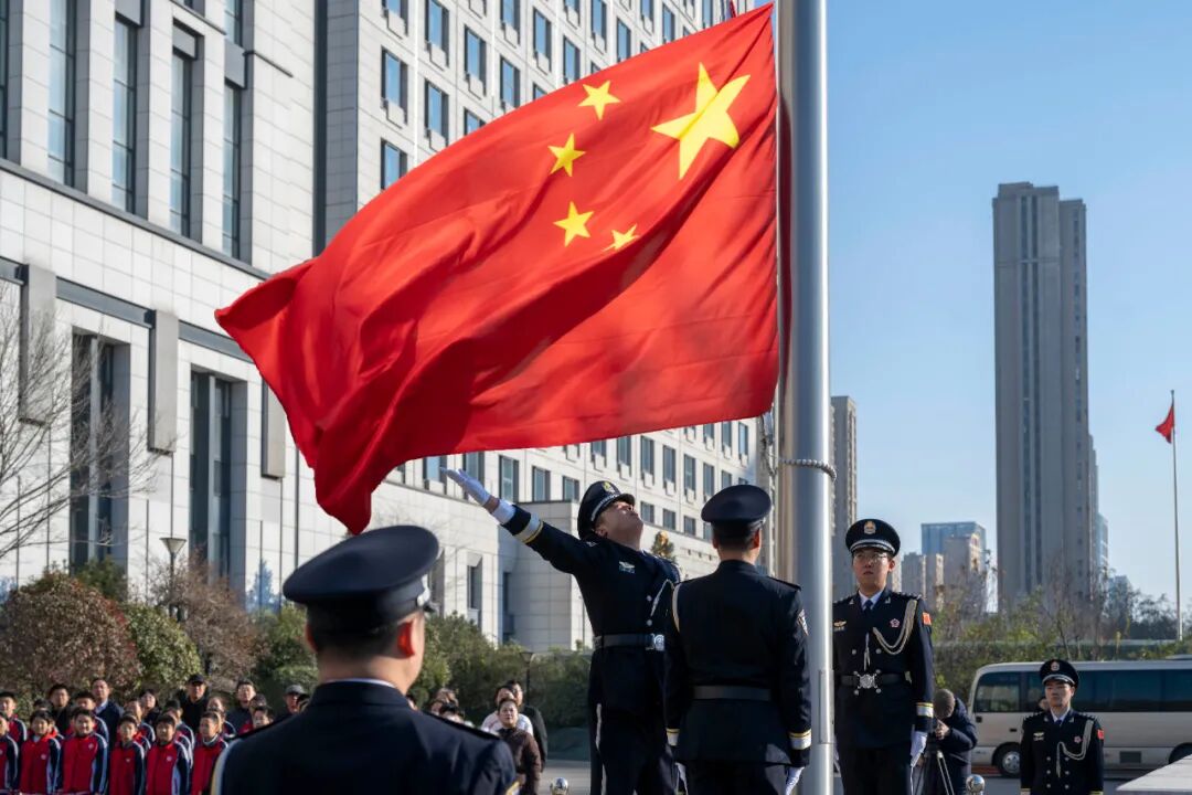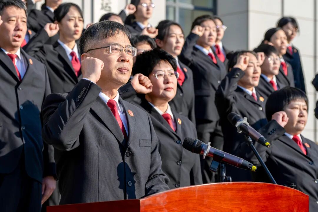 铁路中院党组书记、院长李军抚按《中华人民共和国宪法》,右手举拳,领诵誓词,全体干警面向国旗,整齐跟诵,铿锵誓言久久回响,激荡人心,充分彰显了铁法干警忠诚履职尽责、维护公平正义的坚毅决心。